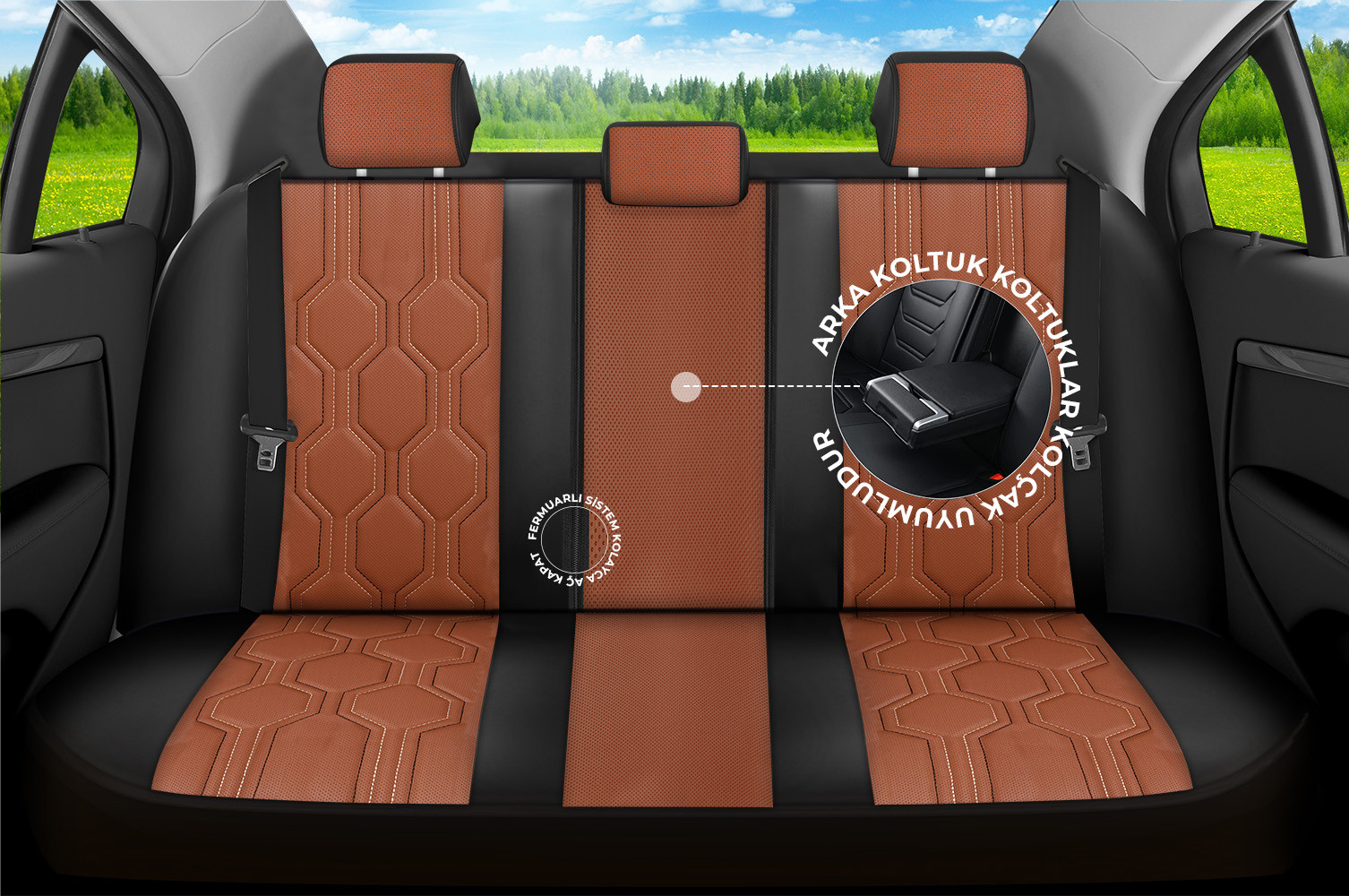 Bütün 5 koltuklu hususi, hafif ticari ve SUV araçlar ile uyumlu Keten veya Deri Oto Koltuk Kılıfı, modüler arka koltuk kılıfı tasarımıyla 2+1 koltukların ve kolçağın kullanımına olanak sunar.