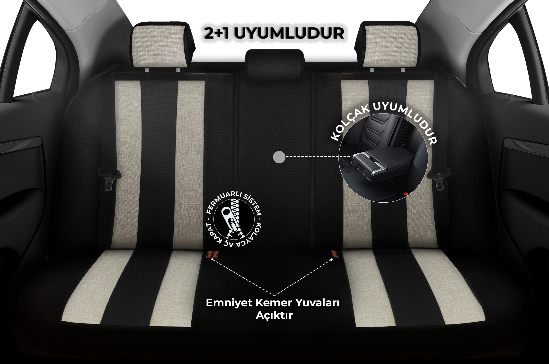Araç arka koltuk yapısı ister 2+1, ister tek parça olsun Kılıfımızdaki fermuarlı sistem ile tam uyum içindedir.