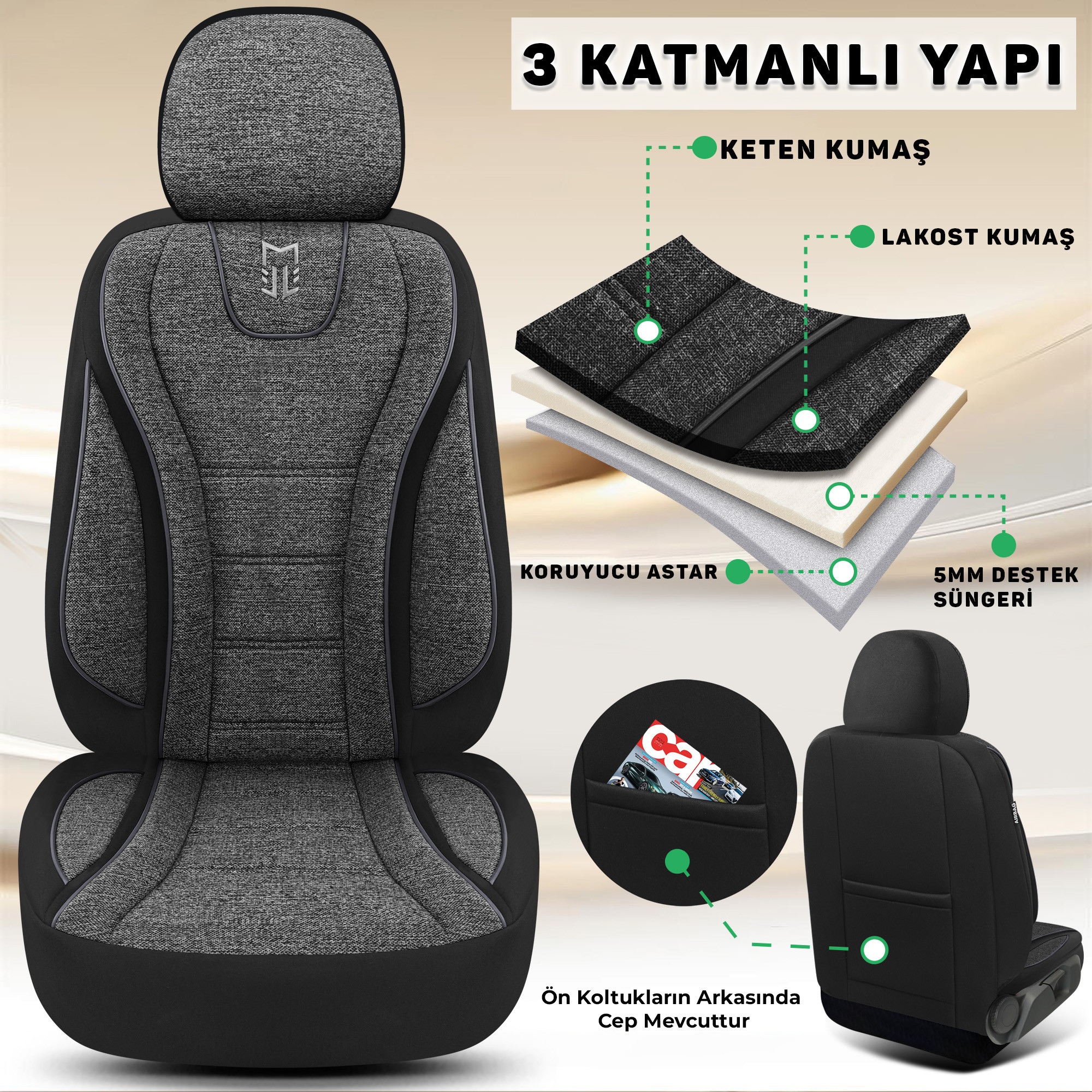 - ✨ Estetik ve Ergonomik Dizayn: Vücudu saran ortopedik yapısı ile sürüş konforunu artırır ve aracınıza modern bir hava katar.