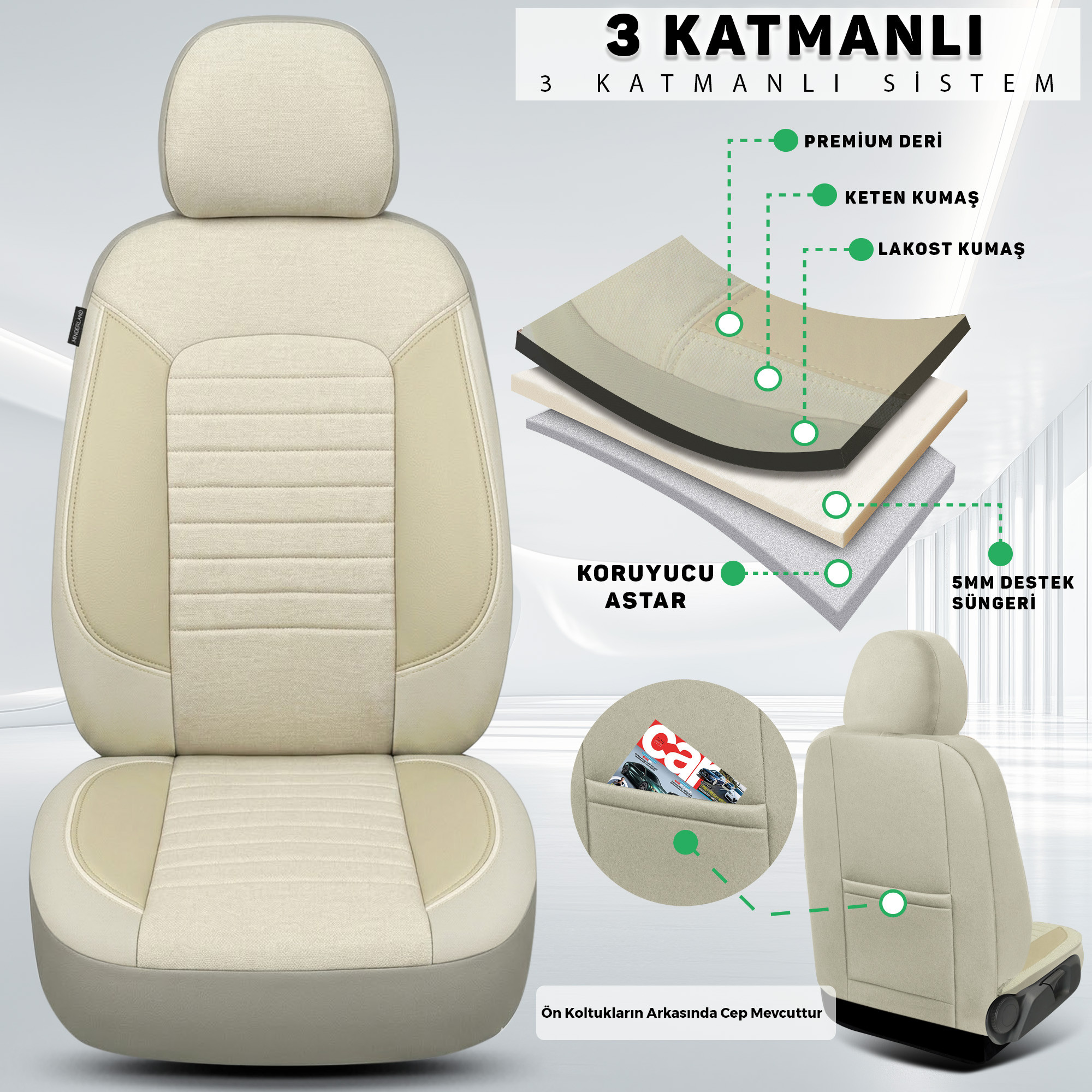 Böylece hem estetik hem güvenli bir kullanım sunar.; Dayanıklı ve nefes alabilen keten kumaş yapısı sayesinde uzun süreli kullanımda konfor sağlar, koltuklarınızı kir, leke ve aşınmalara karşı korur.
