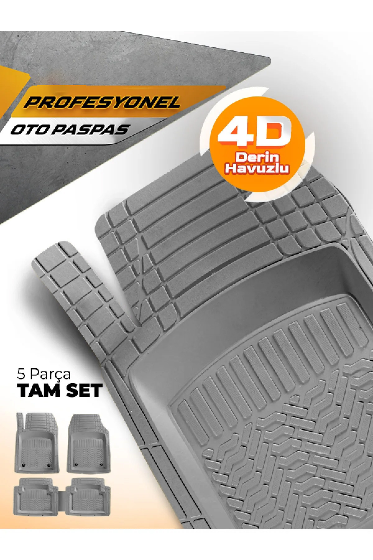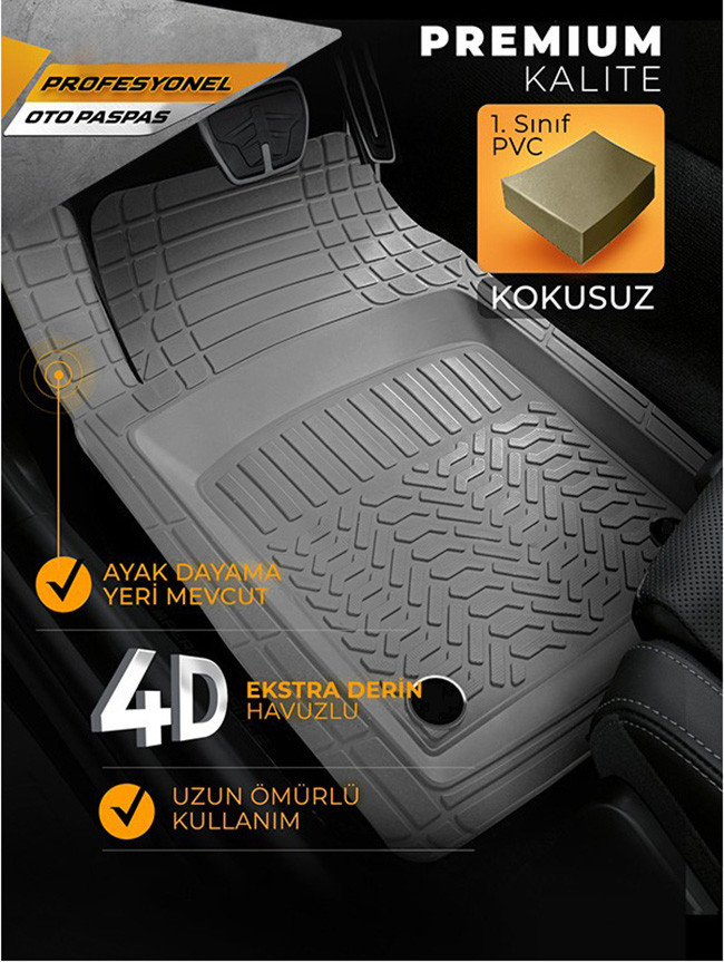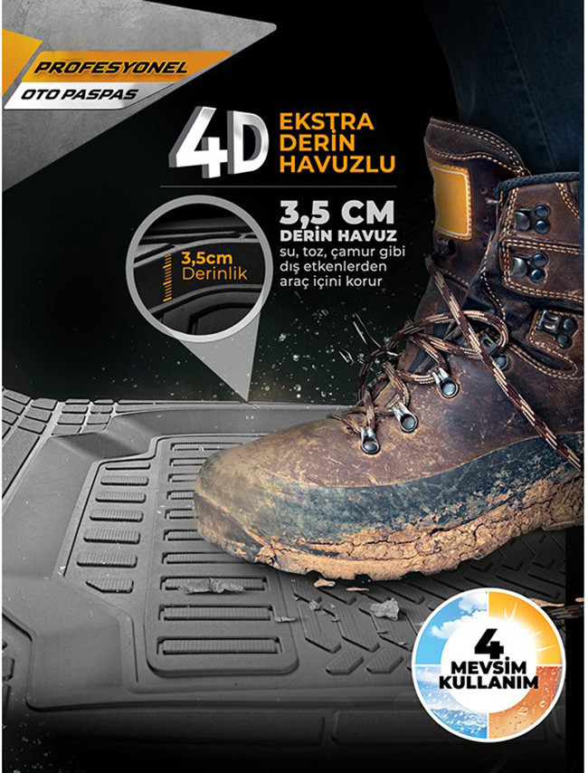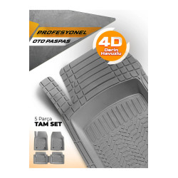 5 parçadan oluşan 4D paspas setimiz bütün binek, hafif ticari ve SUV araçlarla ile uyumludur.